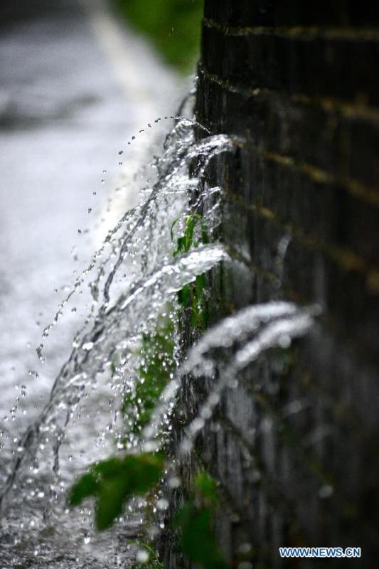 Water seeps through the city wall built in Ming Dynasty (1368-1644) in Nanjing, capital city of east China's Jiangsu Province, June 27, 2015. Rainstorms hit the city on Saturday. Raindrops went through the drainage system in the ancient city wall and were drained to the ground. (Xinhua/Wang Yuewu)
