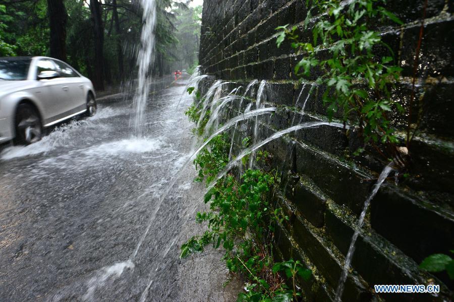 Water seeps through the city wall built in Ming Dynasty (1368-1644) in Nanjing, capital city of east China's Jiangsu Province, June 27, 2015. Rainstorms hit the city on Saturday. Raindrops went through the drainage system in the ancient city wall and were drained to the ground. (Xinhua/Wang Yuewu)