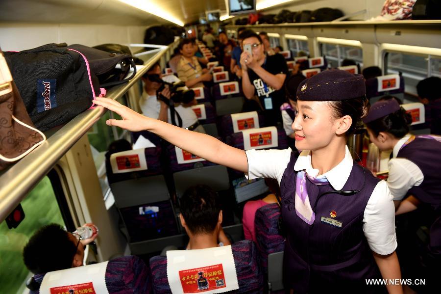 A steward of the G2621 high-speed train from Hefei South to Fuzhou puts away baggage on train, June 28, 2015. The Hefei-Fuzhou high-speed railway was put into operated on Sunday, which spans east China's Anhui, Jiangxi Provinces and also southeast China's Fujian Province and shortens the travel hours from Hefei to southeast China's Fuzhou to within four hours. (Xinhua/Liu Junxi)