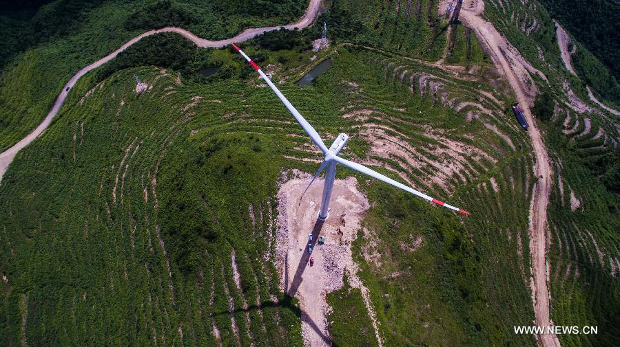Photo taken on June 27, 2015 shows an aerial view of the Weixin wind power farm in Pan'an County, east China's Zhejiang Province. (Xinhua/Xu Yu)