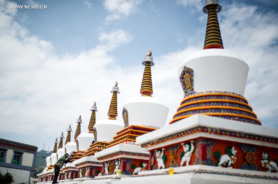 A staff member paints the pagoda at the Taer Monastery in Huangzhong County, northwest China's Qinghai Province, June 27, 2015. As peak tourism season falls recently, eight pagodas in the entrance of the Taer Monastery were repainted to welcome the visitors. (Xinhua/Wu Gang)