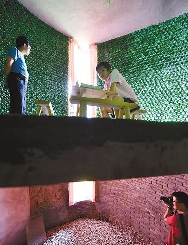 The two-story structure is made of beer bottles at the top level and mud and brick on the lower level. (Photo. Chongqing Evening Post)