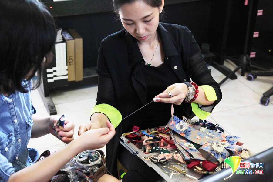 Ma Yi teaches the disabled to make hairpins patiently. (Youth.cn/Cao Di)