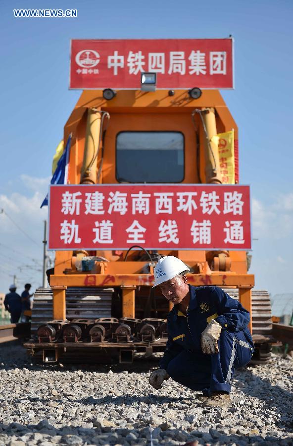 A worker adjusts the central axis of the rail on the western ring of the high-speed rail loop line in south China's Hainan Province, June 30, 2015. The project of high-speed rail loop line in Hainan was officially completed as its western ring and eastern ring were connected as a closed loop on Tuesday. The travelling time between all cities and counties in Hainan will be within three hours once the loop line is opened to traffic. (Xinhua/Guo Cheng)