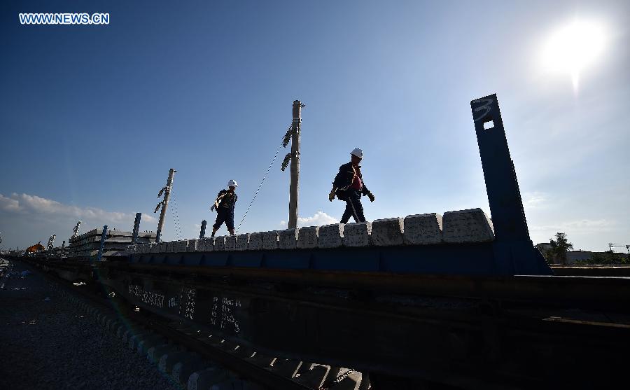 Workers lay the last section of steel rail on the western ring of the high-speed rail loop line in south China's Hainan Province, June 30, 2015. The project of high-speed rail loop line in Hainan was officially completed as its western ring and eastern ring were connected as a closed loop on Tuesday. The travelling time between all cities and counties in Hainan will be within three hours once the loop line is opened to traffic. (Xinhua/Guo Cheng)