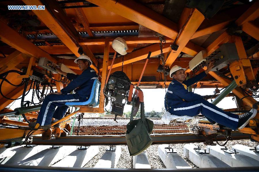 | Workers lay the last section of steel rail on the western ring of the high-speed rail loop line in south China's Hainan Province, June 30, 2015. The project of high-speed rail loop line in Hainan was officially completed as its western ring and eastern ring were connected as a closed loop on Tuesday. The travelling time between all cities and counties in Hainan will be within three hours once the loop line is opened to traffic. (Xinhua/Guo Cheng) |