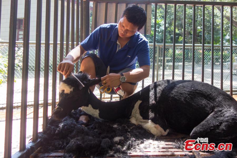 A keeper takes care of an animal at a zoo in Liuzhou city, Southwest China’s Guangxi Zhuang autonomous region, June 30, 2015. The zoo has tried different ways to help animals feel cool as the city suffered lingering heat waves. Temperature rose to 36 degrees Celsius on Tuesday. (Photo: China News Service/Huang Weiming)