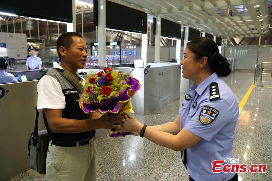 | A Taiwan man is greeted with flowers at a port in Guangzhou, South China’s Guangdong province, July 1, 2015. The man was the first to visit the mainland after the mainland removed the entry permit requirement for Taiwan residents starting from July 1. In the past, Taiwan residents had to apply for a visa-like entry permit to visit the mainland. (Photo: China News Service/Xie Daxin) |