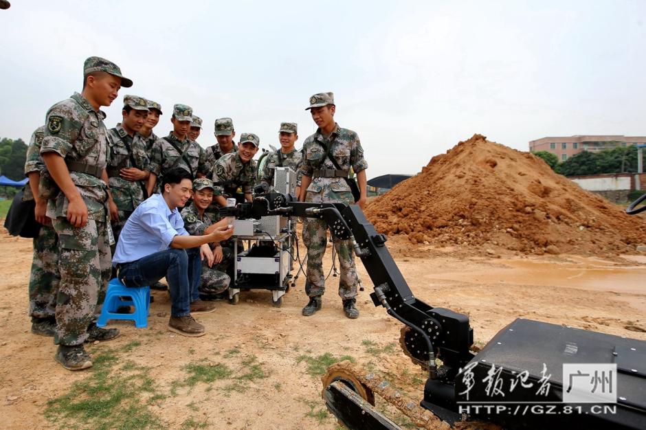 | Lingxi, a PLA EOD (explosive ordnance disposal) robot, shows grabbing skills in a military training field in Guangzhou, capital of south China's Guangdong province. (Photo/GZ.81.CN) |