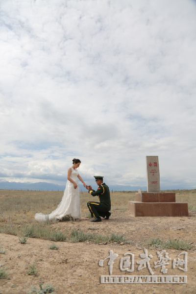 | At the border between China and Kazakhstan, Mulati, an ethnic Kazakh police officer at the Dulata border inspection station, has a romantic wedding with his bride Senbati, who is also ethnic Kazakh, on May 28, 2015. (Photo/wj.81.cn) |