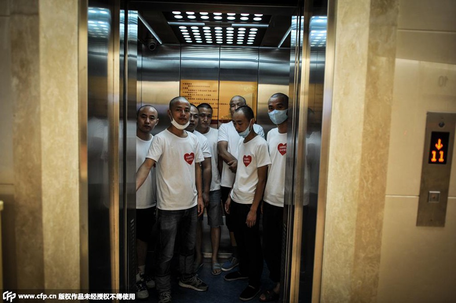 Eleven Chinese fathers who have their heads shaved set up a bald father supporting group for those children with leukemia in China. (Photo/ CFP)