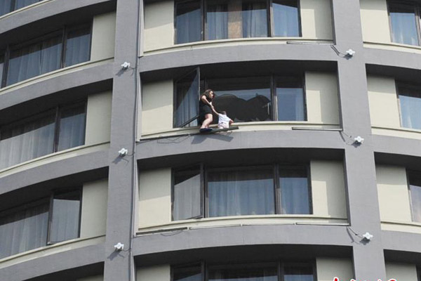 On June 29, 2015, a woman who climbed to the 13th floor of a high-rise building with her 2-year-old daughter threatens to jump off the building in Guilin, south China’s Guangxi. The woman said to the rescuers in tears that her husband was addicted to gambling and often beat her. She would not come down unless she can divorce her husband on the spot. At last the woman climbed back into the room after the staff of the civil affairs bureau came to help her and her husband sign divorce papers.