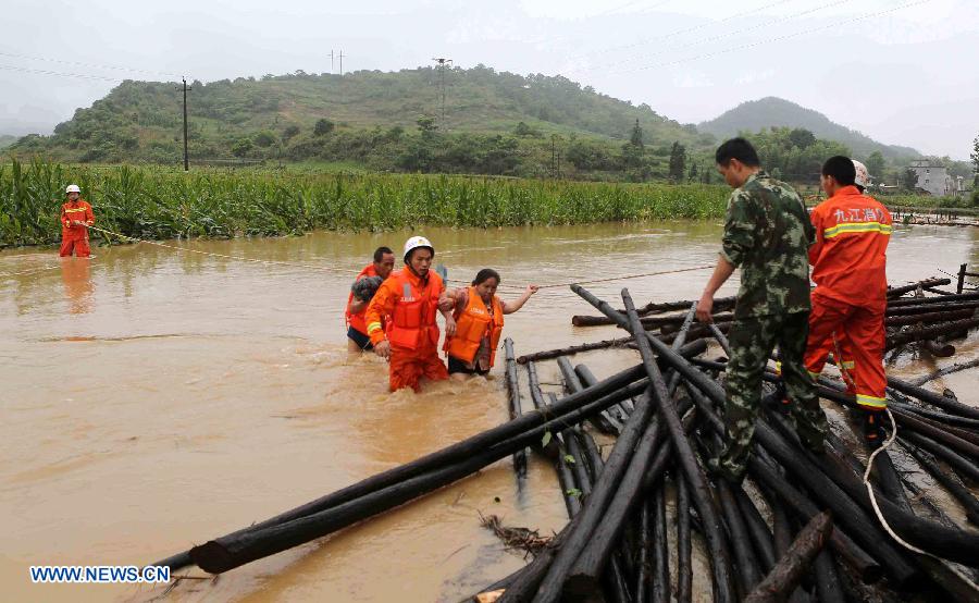 Rescuers evacuate villagers in flood at Qingjiang Township of Wuning County, east China's Jiangxi Province, July 1, 2015. Rainstorm hit the township on Wednesday, triggering flood that stranded 14 villagers. (Xinhua/Jiang Dexian)