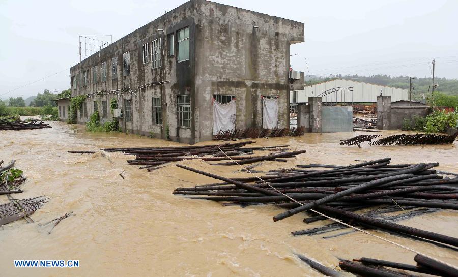 A timber mill is seen in flood at Qingjiang Township of Wuning County, east China's Jiangxi Province, July 1, 2015. Rainstorm hit the township on Wednesday, triggering flood that stranded 14 villagers. (Xinhua/Jiang Dexian)