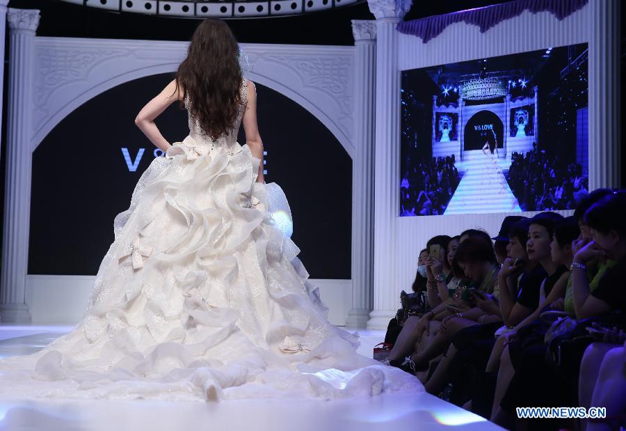 | A model presents a wedding dress during 2015 China Wedding Expo in Shanghai, east China, July 2, 2015. The expo kicked off on Thursday. (Xinhua/Pei Xin) |