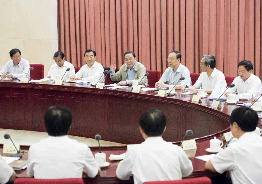 | Yu Zhengsheng (4th L, rear), chairman of the National Committee of the Chinese People's Political Consultative Conference (CPPCC), presides over a seminar on rural land rights approval and related legal issues in Beijing, capital of China, July 2, 2015. (Xinhua/Wang Ye) |
