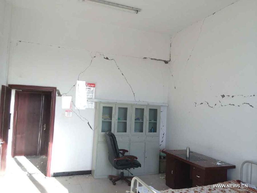 Photo taken with a cellphone on July 3, 2015 shows cracks on a building wall at the Pishan Fire Brigade after a 6.5-magnitude earthquake in Pishan County, northwest China's Xinjiang Uygur Autonomous Region. (Xinhua/Bian Kaiqiang)