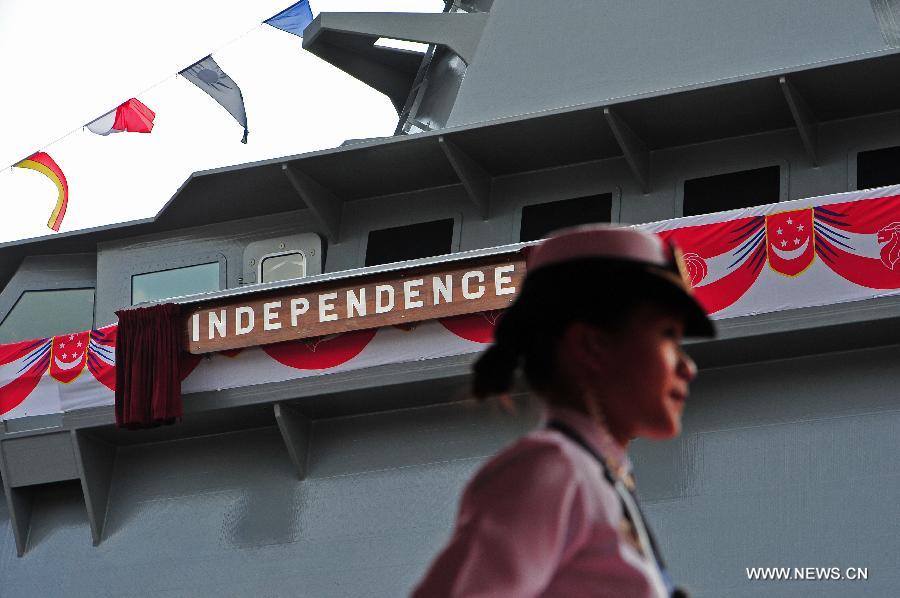 A member of Singapore Navy passes by littoral mission vessel "RSS Independence" during a launch ceremony at Singapore's ST Marine Benoi Shipyard, July 3, 2015. Singapore Navy on Friday held a launch ceremony for its very first of six littoral mission vessels "RSS Independence". (Xinhua/Then Chih Wey)