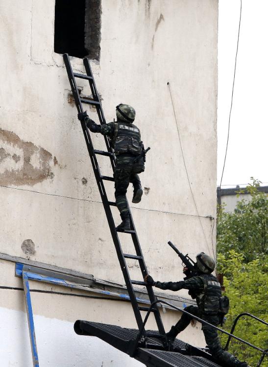 The No.9 detachment of Shanghai Armed Police Corps conducts an anti-terrorism drill on July 2, 2015. Equipped with corner shot guns and other special equipment, the soldiers completed a series of training subjects, such as quick approach, armed assault, emergency rescue, so as to improve their emergency response ability. (Photo/xinhua)
