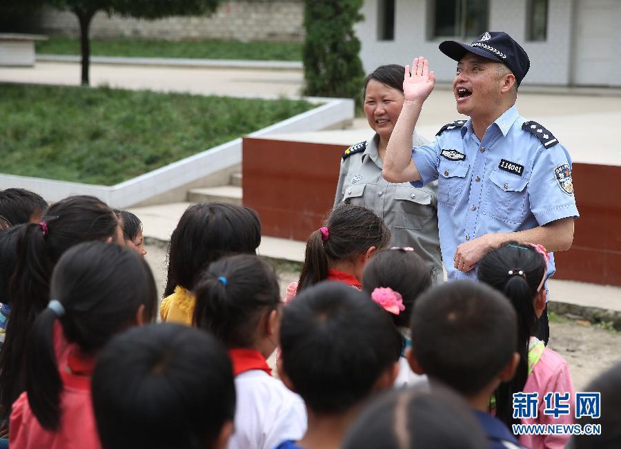 Pan Yong, the blind policeman of Lanba police station, gives a speech on security in a local primary school with his wife. (Xinhua/Wang Shen)