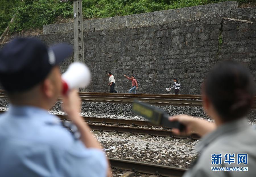 Pan Yong, the blind policeman of Lanba police station, gives a speech on security beside the railway with his wife. (Xinhua/Wang Shen)
