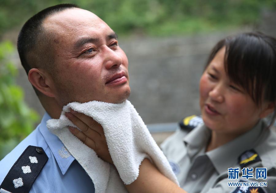 Tao Hongying wipes the face for her husband. (Xinhua/Wang Shen)