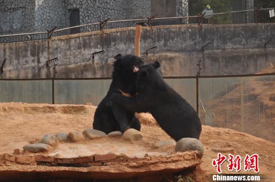 A villager in Yunnan province bought two “dogs” from a Vietnamese two years ago. This year, he found they turned out to be black bears, a class II protected species in China. Recently the bears have been sent to Yunnan wild animal shelter. The two bears play in Yunnan wild animal shelter. (CNS/Baituo)