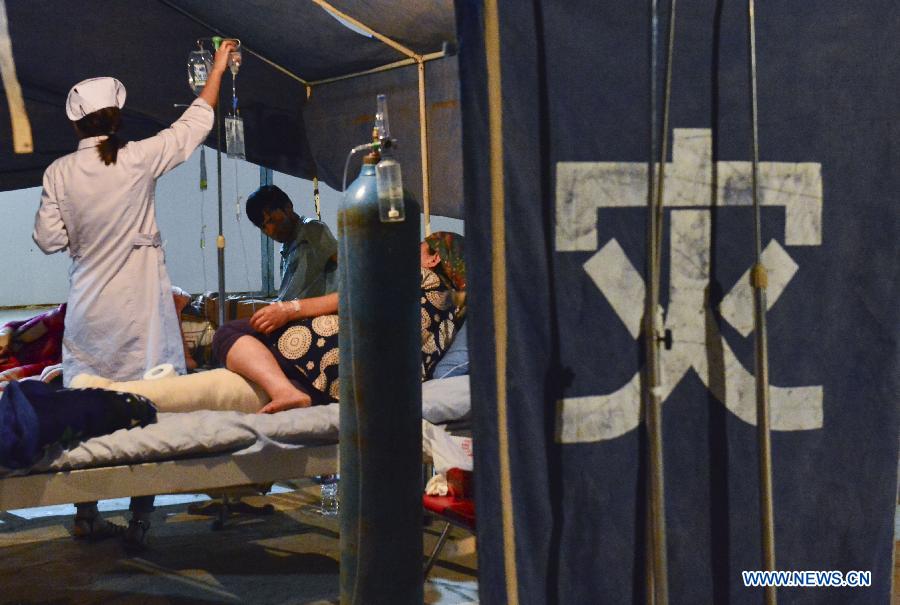 Doctors treat injured residents in a tent in Pishan County of Hotan Prefecture, northwest China's Xinjiang Uygur Autonomous Region, July 4, 2015. A 6.5-magnitude earthquake rocked Pishan County of Hotan Prefecture at 9:07 a.m. (0107GMT), with the epicenter recorded at 37.6 degrees north and 78.2 degrees east, according to the China Earthquake Networks Center (CENC). Three people were killed and 71 others injured in the quake. Local government has erected 1,500 tents to accomodate residents affected by the earthquake. (Xinhua/Shen Qiao)