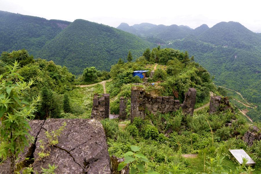 | Photo taken on June 30, 2015 shows a scene of Hailongtun Fortress in southwest China's Guizhou Province. Tusi sites -- the remains of an ancient political system adopted by Chinese emperors to govern ethnic minority regions in south-central and southwest China -- were inscribed in the World Heritage List on Saturday. The inscribed sites, located in mountainous areas, are Laosicheng in Hunan Province, Tangya in Hubei Province and Hailongtun Fortress in Guizhou Province. Tusi literally means hereditary tribal headmen appointed by Chinese emperors to govern the often unruly ethnic minority regions in the central and western parts of south China, where the specific tribal governance system was adopted from the 13th to the early 20th century. (Xinhua/Luo Xinghan) |
