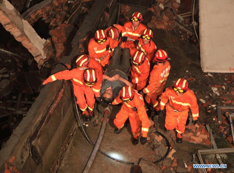 Rescuers carry an injured person at a collapsed factory building in Wenling, east China's Zhejiang Province, July 4, 2015. Nine people were still trapped in the rubble of a factory building that collapsed on Saturday afternoon in east China's Zhejiang Province. (Xinhua)