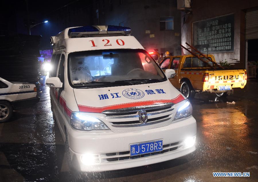 | An ambulance stops at the accident site in Daxi Town of Wenling City, east China's Zhejiang Province, July 5, 2015. The Jieyu Shoe Factory in Daxi Town collapsed Saturday afternoon, leaving six people dead. (Xinhua/Han Chuanhao) |