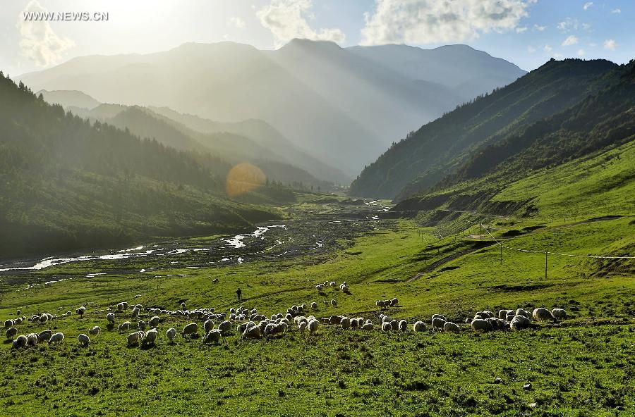 Flocks of sheep eat grass on the pasture in the Qilian Mountains in Wuwei, northwest China's Gansu Province, July 5, 2015. (Xinhua/Jiang Aiping)