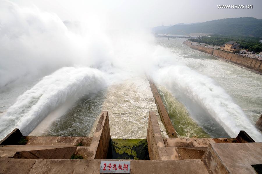 Tourists look at water cascades generated by the Xiaolangdi Dam on the Yellow River in Jiyuan, central China's Henan Province, July 5, 2015. The artificial water cascades generated by the Xiaolangdi Dam on the Yellow River are feasts for the eyes for tourists when the dam does its annual de-sedimentation between late June and early July. (Xinhua/Miao Qiunao)