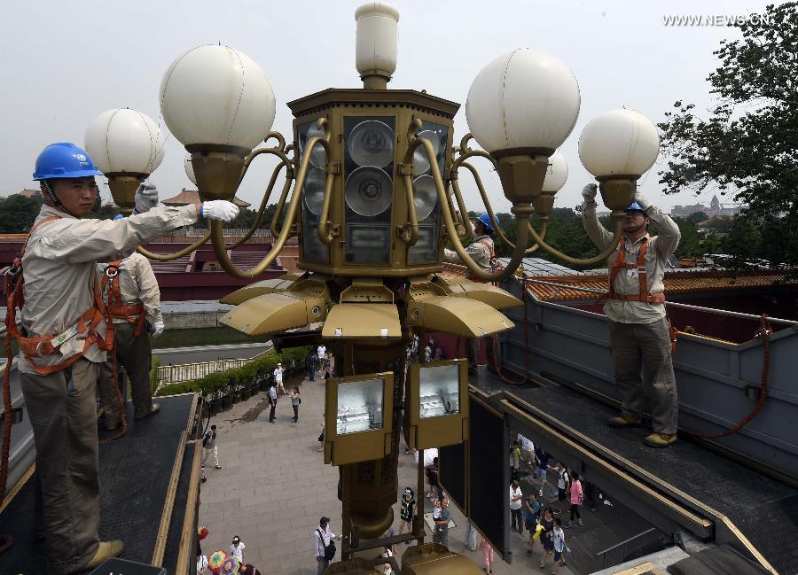 Workers clean and overhaul a lamp during the annual maintenance of city lamps near Tian'anmen Square, in Beijing, capital of China, July 6, 2015. (Xinhua/Gong Lei)