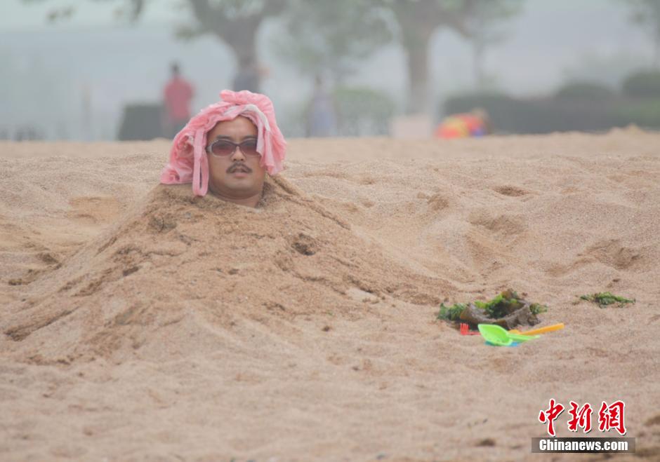 A man buries himself in the sand for refreshing on the beach in Qingdao, east China's Shandong province on July 1, 2011 (CNS/Huang Xianjie)
