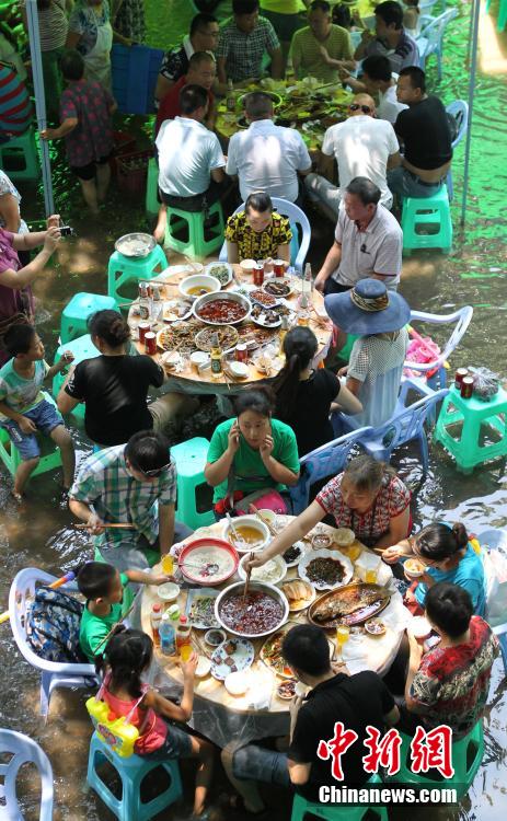 To cool off, local residents have meal in the water of a river in Chongqing on July 26, 2014. (CNS/Zhou YI)