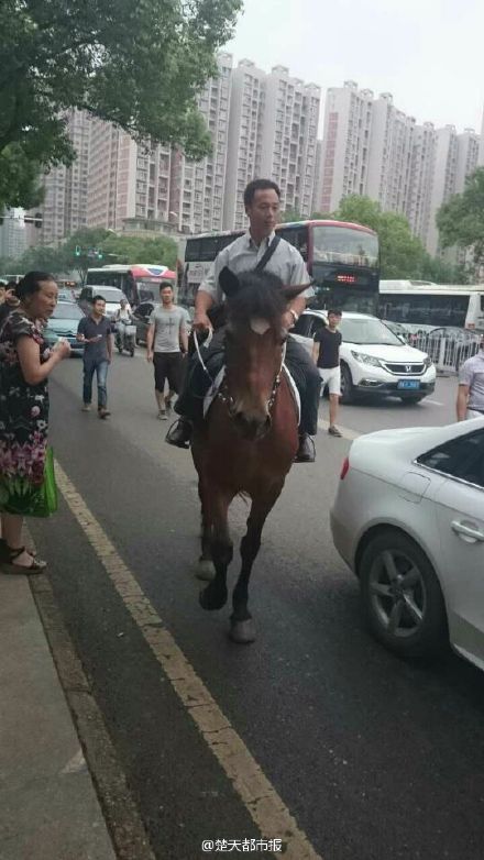 A man rides a horse to work in Wuhan, capital city of central China's Hubei province, July 6, 2015. The man is a member of an equestrian club in Wuhan. He said that he was often late for work due to the traffic jam. Therefore, he gives up the car and chooses to ride a horse instead. (Photo/weibo of Chutian Metropolis Daily)
