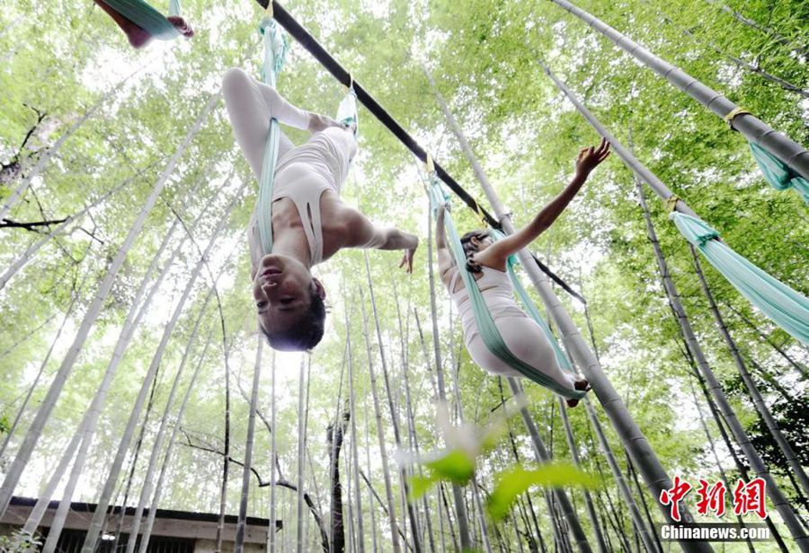 Yoga experts perform a stunt show on swings to raise people's health awareness in a bamboo forest in Shiyan Lake Park in Changsha, Hunan province on July 4, 2015. (Photo/ Yang Huafeng)