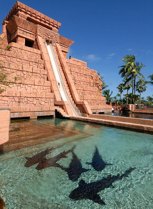 Leap of Faith is built at the duplicate Mayan Temple in Bahamas. On the top of the slides, people can see the sharks in the side pools.(Screenshot/Xinhuanet)