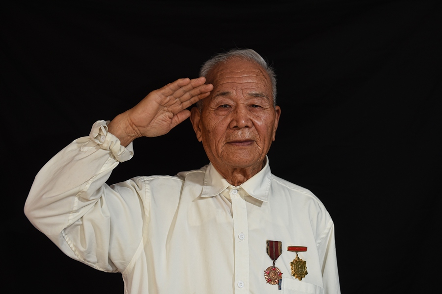 Yang Junshan, 87, joined in anti-Japanese armed force with his elder brother when he was a teenager. On occasion of the 70th anniversary of the victory of the War of Chinese People's Resistance against Japanese Aggression, a Xinhua reporter takes photos of nine veterans’ salutes in Chengde, north China’s Hebei province. (Photo/Xinhua)