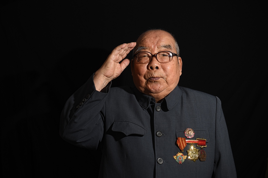 Hu Qing, 88, became a underground Party member when he was sixteen years old and disseminated information and kept a close watch on the enemy's movements. On occasion of the 70th anniversary of the victory of the War of Chinese People's Resistance against Japanese Aggression, a Xinhua reporter takes photos of nine veterans’ salutes in Chengde, north China’s Hebei province. (Photo/Xinhua)