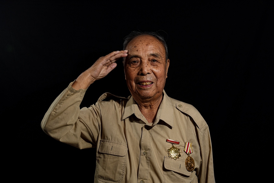 Li Zhenqi, 89, whose parents died when he was a little boy. He became a messenger for Chinese army at the age of 16 and joined in Chinese army officially in 1945. On occasion of the 70th anniversary of the victory of the War of Chinese People's Resistance against Japanese Aggression, a Xinhua reporter takes photos of nine veterans’ salutes in Chengde, north China’s Hebei province. (Photo/Xinhua)