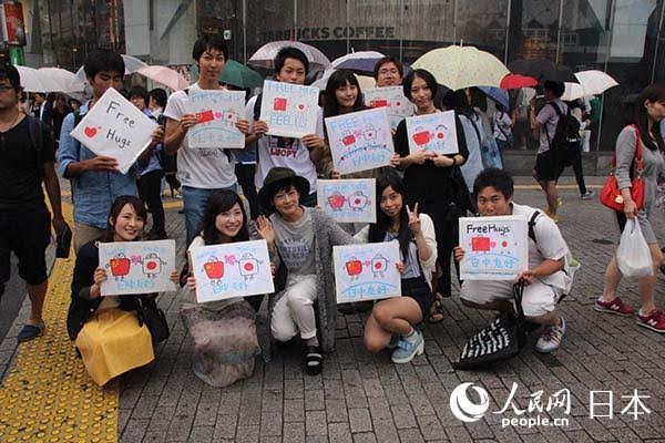 On July 5th, more than a dozen young adults from China and Japan gathered at Shibuya, one of the most bustling streets in Tokyo. They carried out a campaign called the “Chinese-Japanese friendship hug.” Chinese students studying in Japan sponsored the activities. They held “Chinese-Japanese friendship” signs on the street and hugged passersby in order to demonstrate the everlasting friendship between China and Japan. (Reported by People's Daily Online Japan, original story link http://japan.people.com.cn/n/2015/0706/c35467-27257636.html)