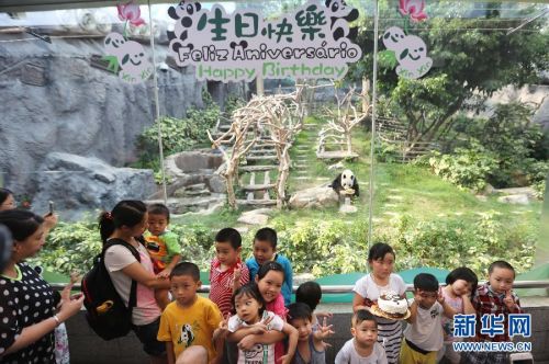 The special administrative region's Civic and Municipal Affairs Bureau held a special party for the panda, presenting tailor-made ice cake made out of juice with fresh fruits and vegetables on the top, as well as organizing dozens of little panda fans singing " happy birthday song" to her in the panda pavilion at Seac Pai Van Park.
