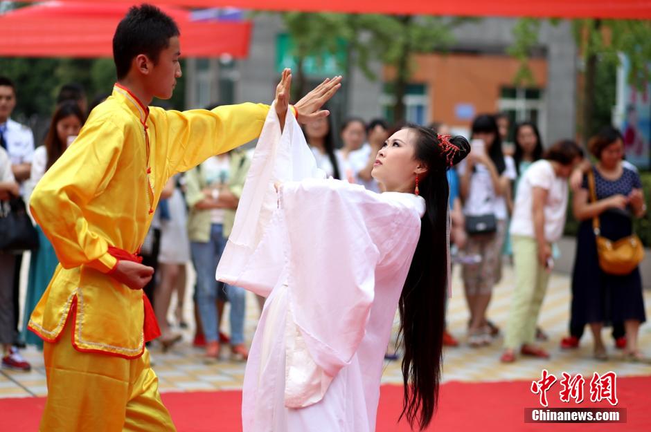 6 students majoring flight attendance holds a talent competition on campus to find their true love in southwest China's Chengdu on July 6, 2014. The six girls competed talents such as art martial, tea ceremony with the challengers. "We hold the competition to meet more friends, and to find a soul mate," said one of them. (Photo/Liu Zhongjun)