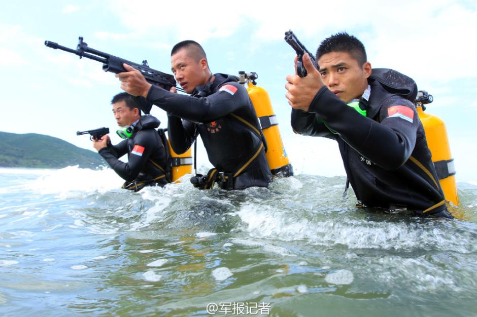 Photos taken on July 7, 2015 show combat training of oceanic diving conducted off the coast of south China's Guangdong province. (Source: Weibo of PLA Daily)