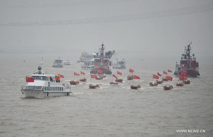 A water rescue drill is held on the Ganjiang River in Nanchang, capital of east China's Jiangxi Province, July 8, 2015. Some 300 people and 33 vessels as well as drones and rescue vehicles were involved in the drill here on Wednesday. (Xinhua/Zhou Mi)