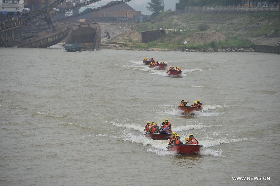 A water rescue drill is held on the Ganjiang River in Nanchang, capital of east China's Jiangxi Province, July 8, 2015. Some 300 people and 33 vessels as well as drones and rescue vehicles were involved in the drill here on Wednesday. (Xinhua/Zhou Mi)