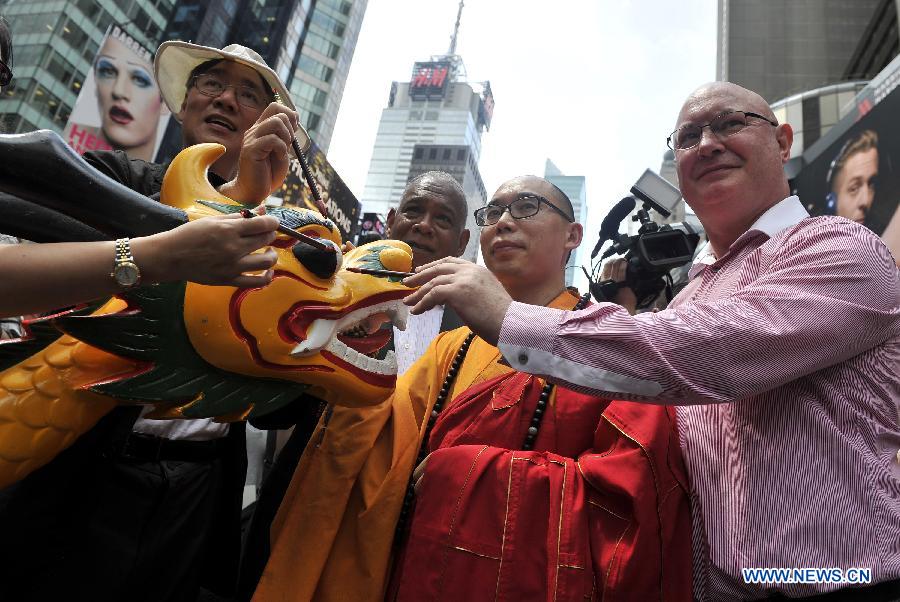 People attend the dragon boat awakening ceremony at Times Square in New York, the United States on July 7, 2015. A dragon boat awakening ceremony is held at Times Square for 25th anniversary Hong Kong dragon boat festival here on Monday. The 25th annual Hong Kong Dragon Boat Festival in New York will be held on Aug. 8 and Aug. 9. (Xinhua/Wang Lei)
