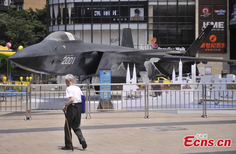 A replica of China’s J-20 stealth fighter is on display in a square in Southwest China’s Chongqing municipality, July 8, 2015. The life size alloy model is 4.5 meters tall, 21.26 meters long, and has a wingspan of 12.88 meters. (Photo: China News Service/Chen Chao)